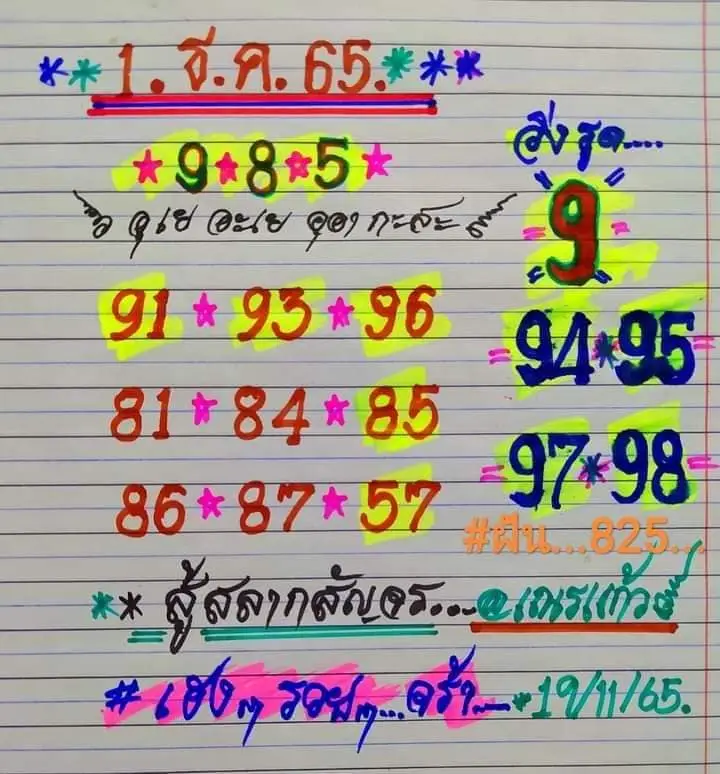 ไปดูกันเลยว่า เลขเด็ด หวยเณรแก้ว ในงวดนี้ ได้ปล่อยเลขดังนี้ เริ่มที่ เล่นเด่น 9 – 8 – 5 วิ่งรูด 9 ตามด้วยเลขสองตัวชุดใหญ่ ทั้ง 91 – 93 – 96 – 81 – 84 – 85 – 86 – 87 – 57 – 94 – 95 -97 – 98 และเลขฝัน หวยเณรแก้ว ให้นั้นก็คือเลขสามตัว 825